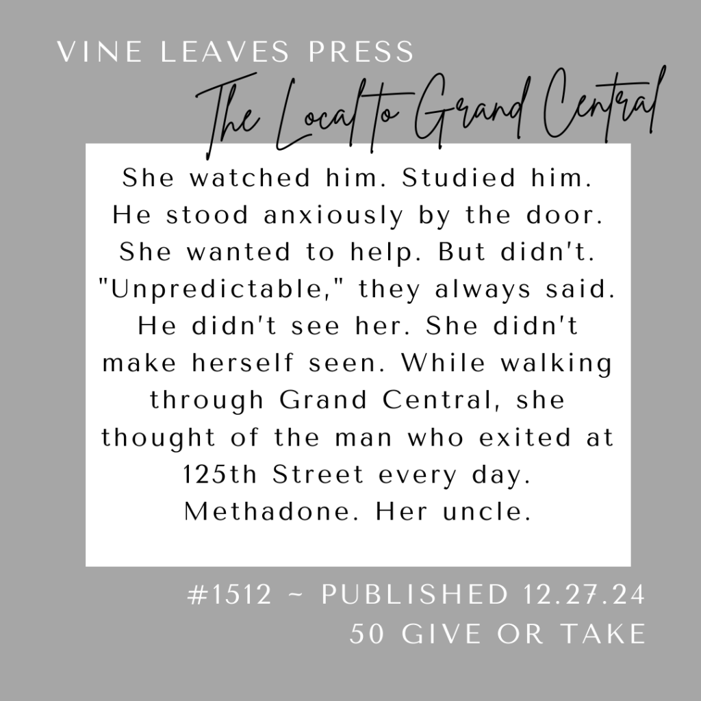 Vine Leaves Press – 50 Give or Take I am very proud to share my micro-fiction pieces that have been published in VLP’s specialized 50 Give or Take genre. The challenge of tiny writing is telling a memorable and impactful story with a beginning, middle and end in only 50 words.